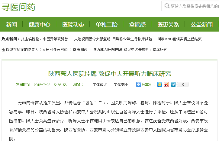【网】陕西聋人定点医院挂牌 敦促中大开展听力临床研究