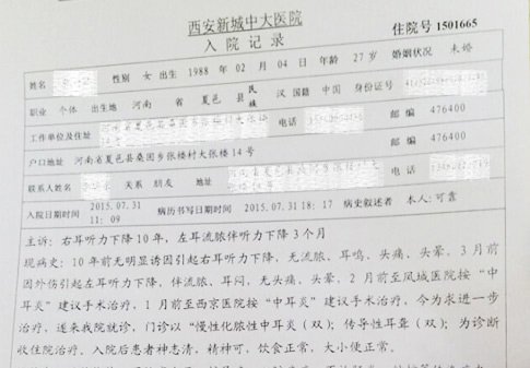 张杨琳先后前往凤城医院和进行了检查诊断。7月31日,她又到西安新城中大耳鼻喉医院接受了检查,在西安中大,通过耳内镜检查、纯音听阀等测试,诊断结果表明,张杨琳患有双耳慢性化脓性中耳炎和双耳传导性耳聋,需要及时进行手术。